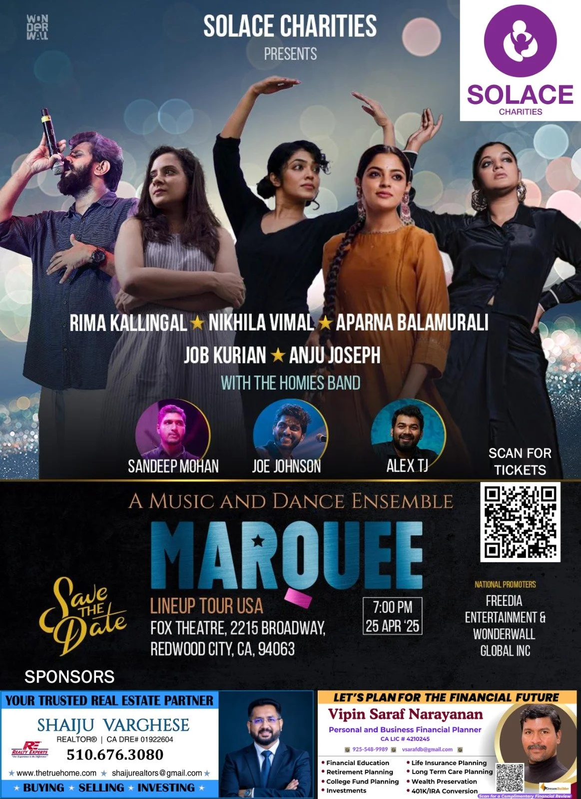This April, the Solace Charities Bay Area chapter presents MARQUEE 2025 - an extraordinary evening of dance and music featuring renowned movie and cultural artists from Kerala.